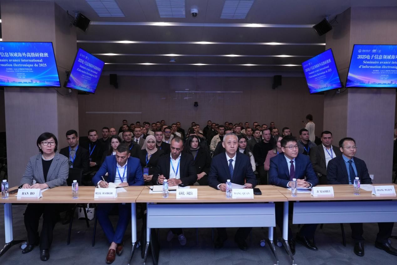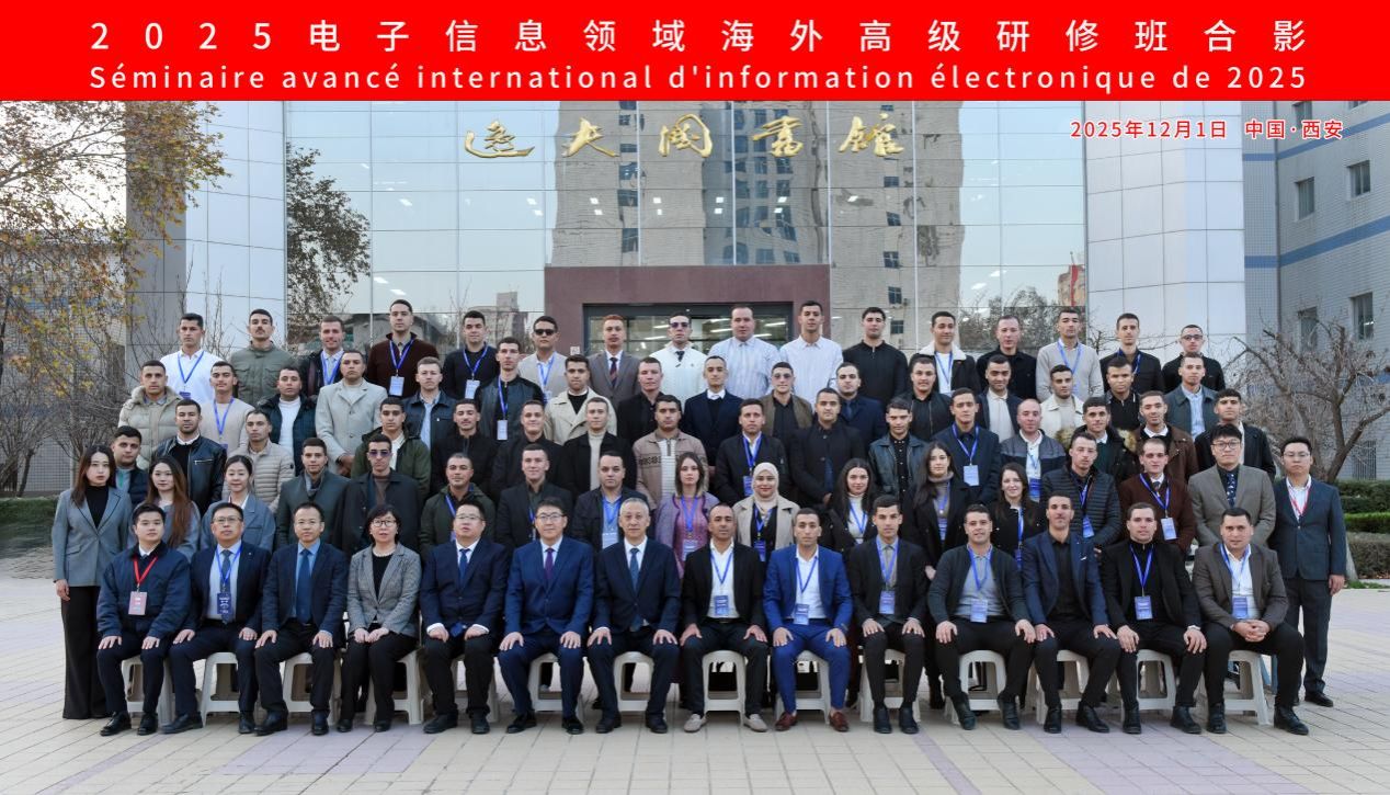 12月1日,2025电子信息领域海外高级研修班开班仪式在西安电子科技大学北校区会议中心举行。西安电子科技大学党委常委、副校长王泉,中国电子产业有限公司(elinc)项目副总指挥纪晓辉,阿尔及利亚学员团长布阿扎・阿德尔,网络与继续教育学院党总支书记张武军,以及67名阿尔及利亚学员参加仪式。开班仪式由网络与继续教育学院院长沈强主持。