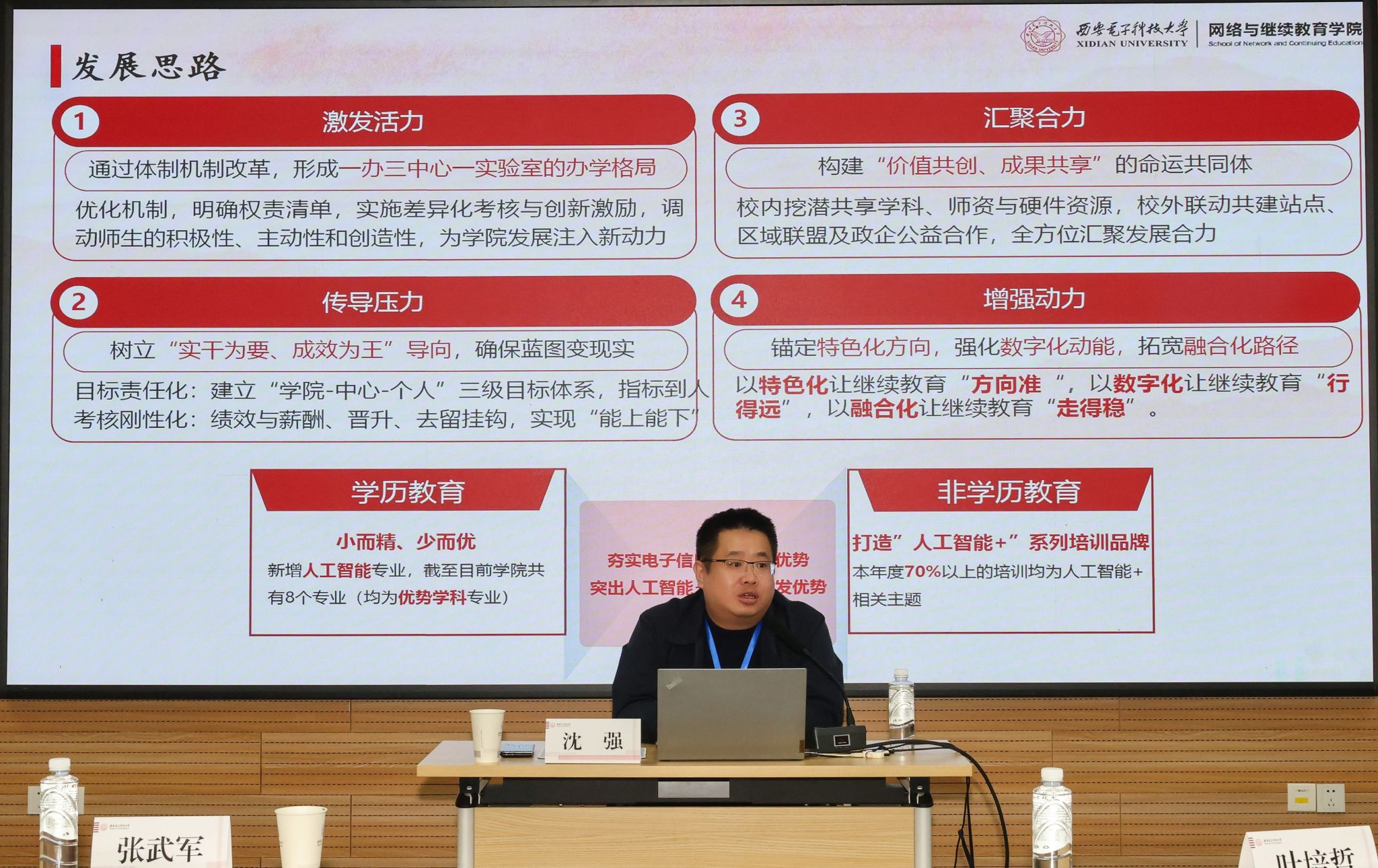 沈强围绕学院在学历继续教育与非学历教育协同发展方面的定位,系统阐述了相关举措,全面展示了学院在转型发展、数字化赋能等方面取得的阶段性成果,并对未来校地协同、教学点合作等重点方向与核心任务进行了展望。报告内容丰富、路径清晰,为全体学员进一步统一思想、明确目标、推动工作落实提供了方向指引与有力支撑。